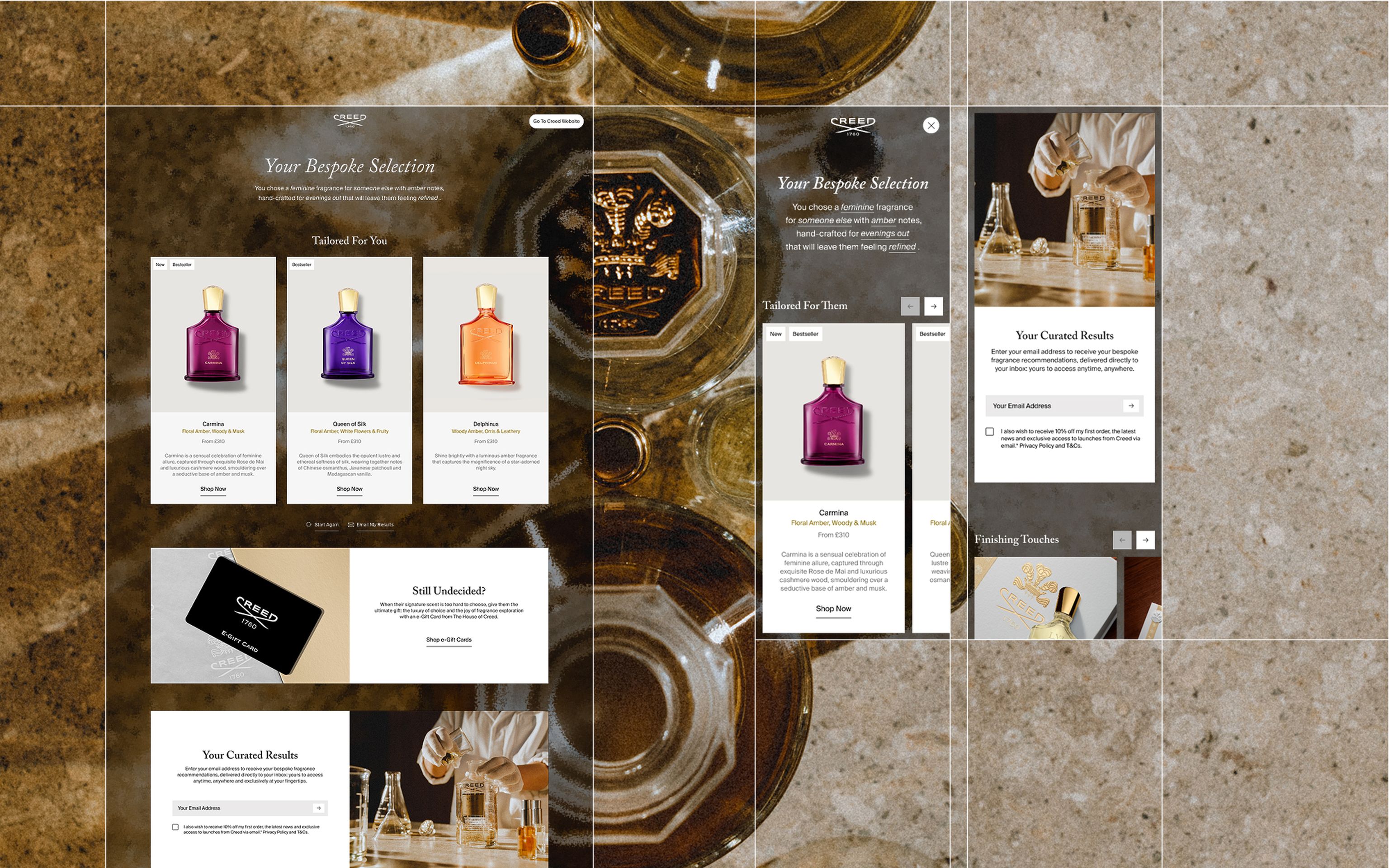 Creed’s Fragrance Finder is a fully bespoke design and build, sitting slightly separate from the main site and shoppable experience. This separation allowed us to create a truly immersive journey, free from distractions such as pop-ups or promotional bars. A reduced navigation was crucial to evoking the luxurious feeling of shopping in one of Creed’s physical stores, guided by a knowledgeable sales assistant, fully focused on the customer and their needs.